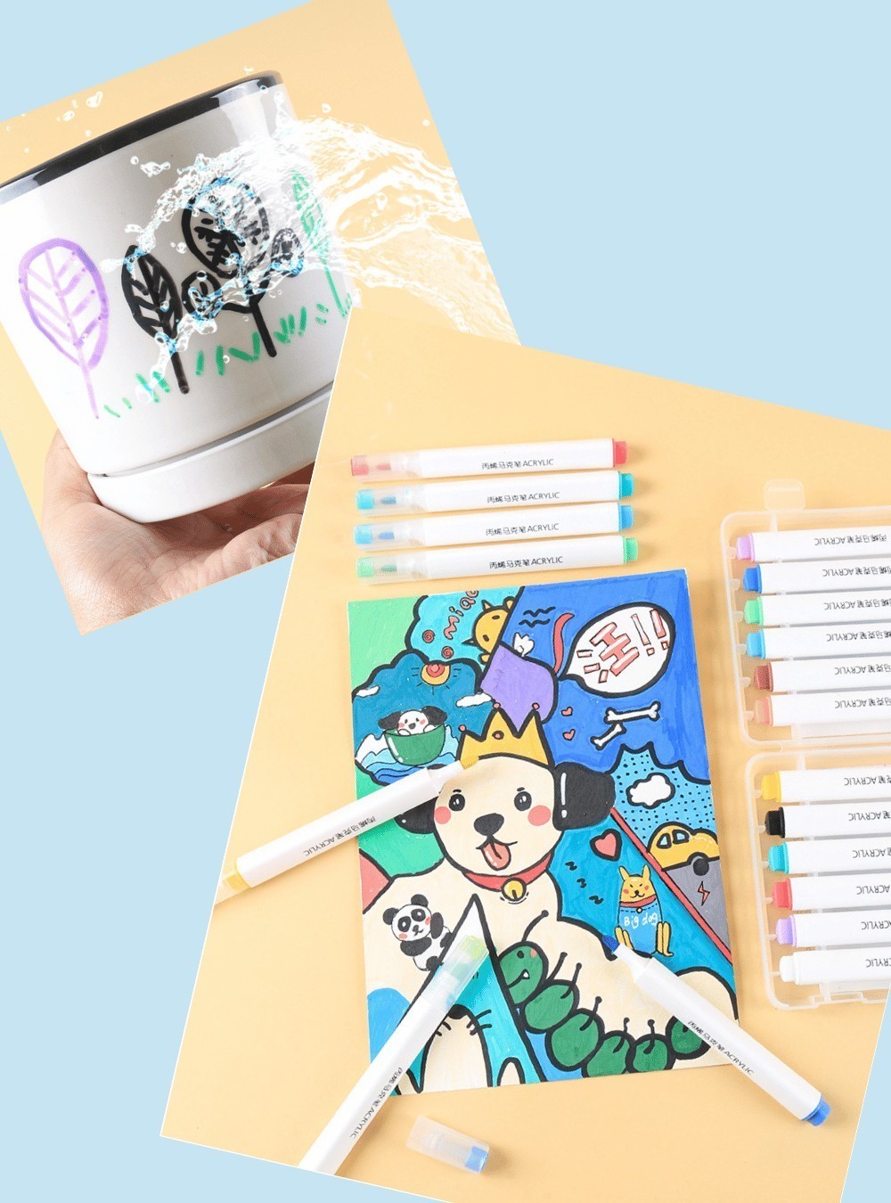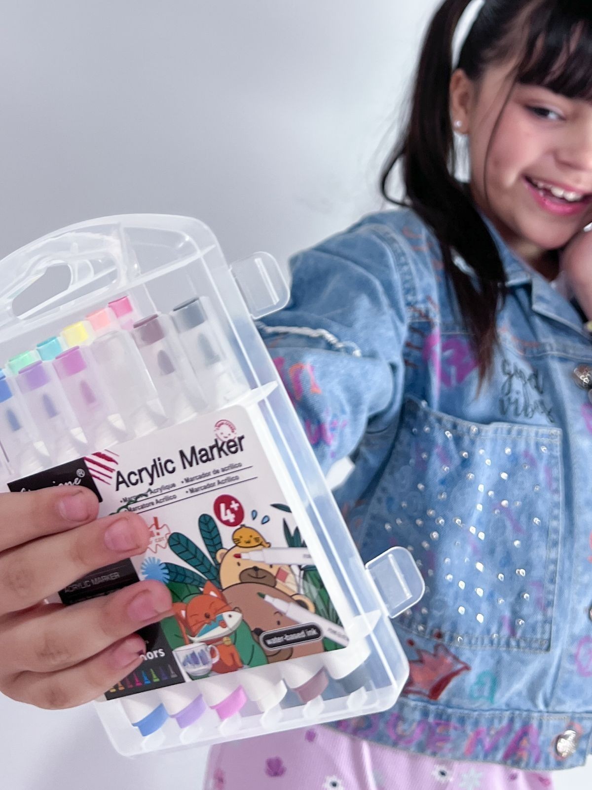 Este set de 12 marcadores acrílicos en colores vibrantes es ideal para niños, jóvenes y adultos que disfrutan de la creatividad. Con tinta a base de agua y punta tipo pincel, son perfectos para pintar sobre papel, cartón, madera, vidrio, plástico y más. Presentados en un práctico estuche rígido con cierre. Ideal para lettering, ilustración, decoración y proyectos escolares.