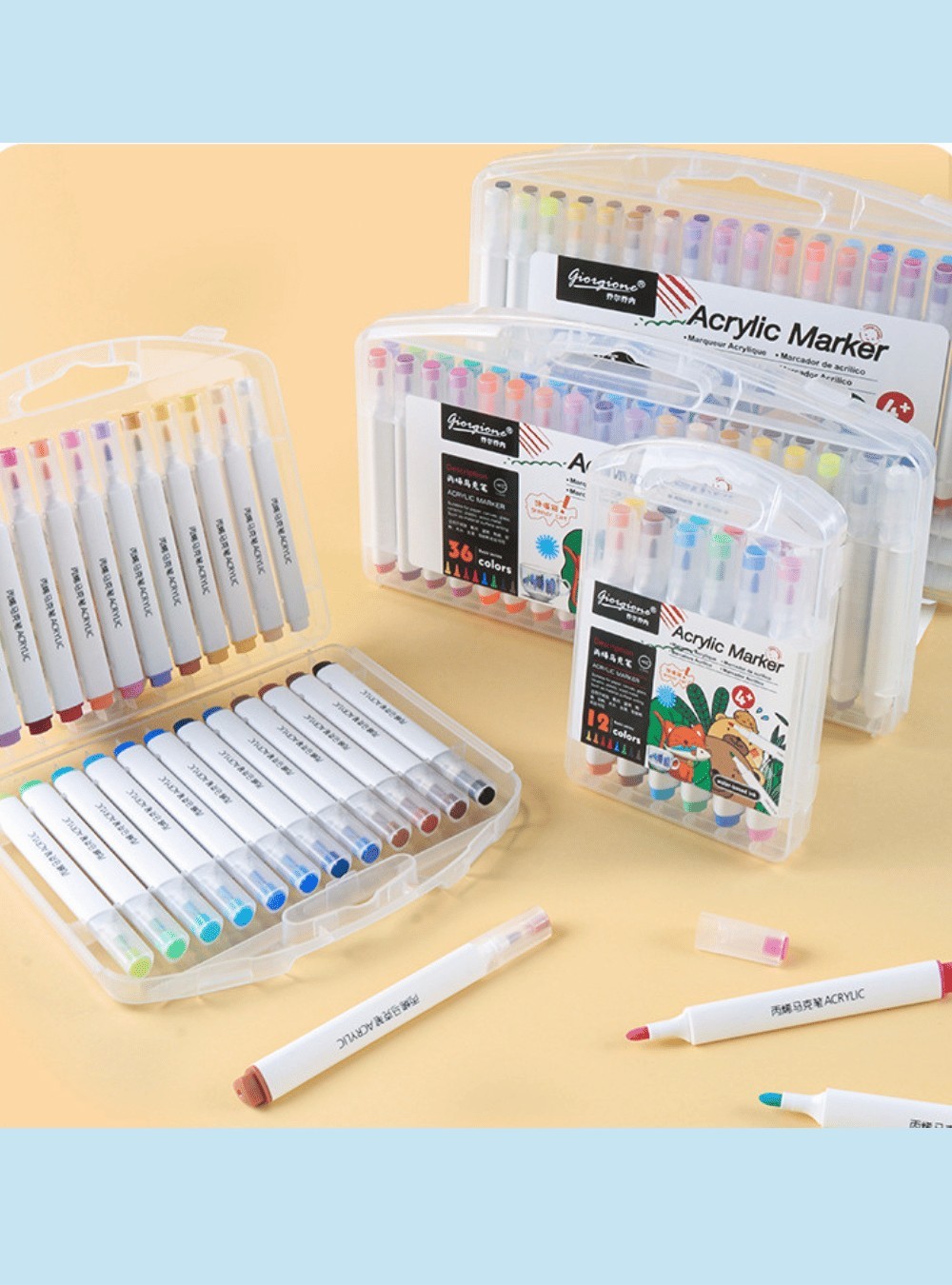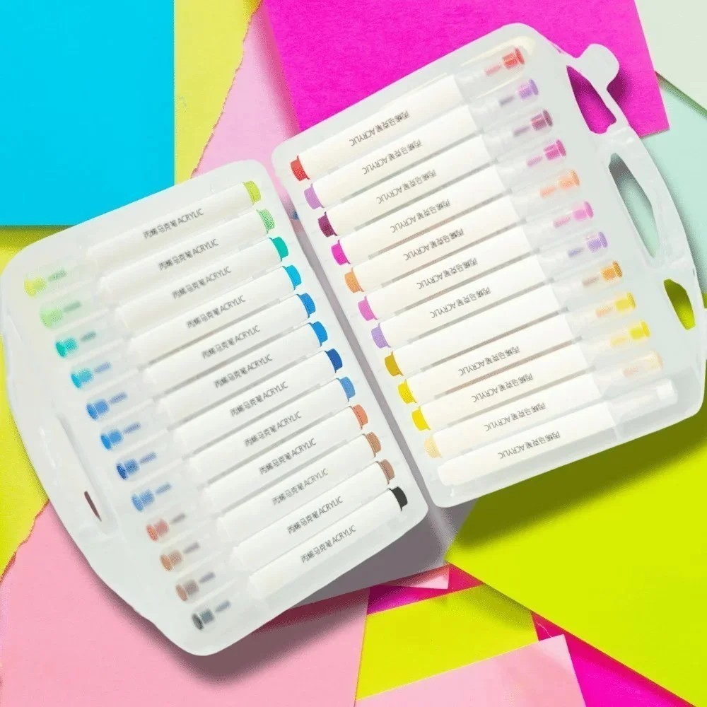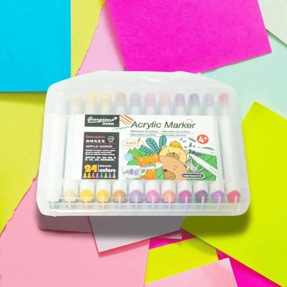 ¡Coloreá sin límites! Este práctico set de 24 marcadores acrílicos es ideal para artistas jóvenes y adultos que quieran explorar su creatividad sobre múltiples superficies. Vienen presentados en una caja plástica resistente con cierre, perfecta para mantenerlos organizados y transportarlos fácilmente. Ideal para manualidades, lettering, decoración o proyectos escolares. ¡Colores brillantes, trazos definidos y diversión asegurada!
